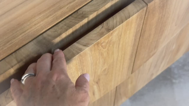 Accessing your items is seamless with six fully opening doors revealing a fixed middle shelf. Crafted from 100% sustainably sourced and certified plantation teak with a water-based finish, the Brooklyn Sideboard is designed for longevity. Soft-close doors provide a smooth and luxurious user experience.